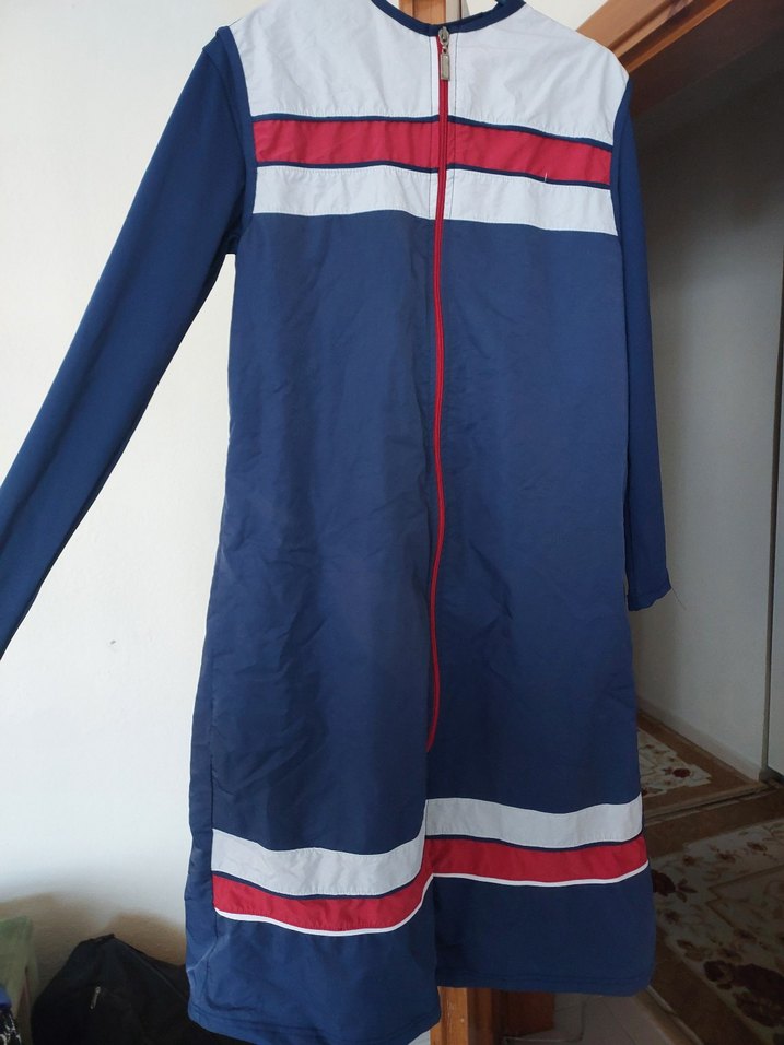 Fermuarlı, uzun kollu lacivert renkli, kırmızı ve beyaz şeritli, beli ayarlanabilir lastikli tesettür mayo, haşema. Toplam 4 parça. S beden. Omuzdan itibaren yaklaşık 97 cm. 2 3 kez giyildi. Artık bedeni olmadığı için satıyorum. Sorunsuz.