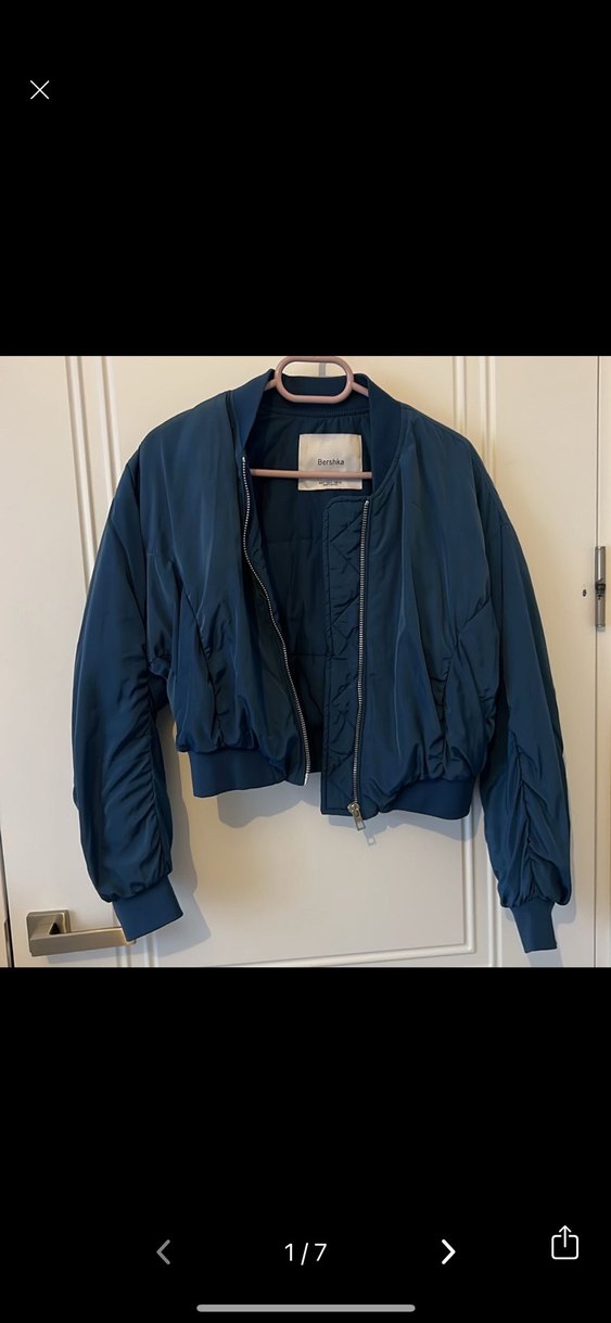 Fermuarlı ön kısmı, uzun kollu ve kesimli lacivert kadın ceketi. Düz sentetik kumaştan üretilmiş, günlük kullanıma uygun. Hiçbir deformesi yoktur.