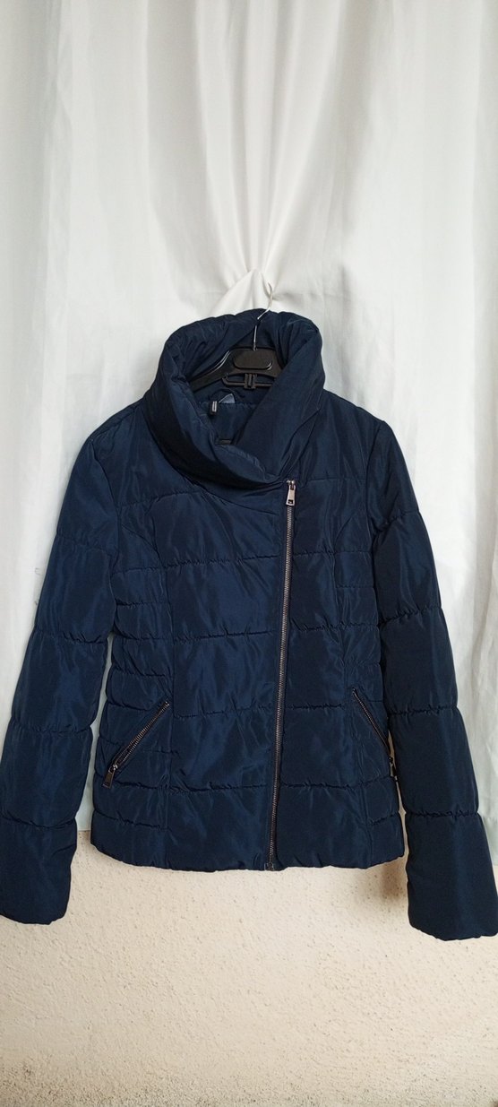 Fermuarlı, yüksek yakalı ve normal boyda lacivert kadın mont. Düz yüzeyli ve günlük kullanıma uygun şık tasarım.