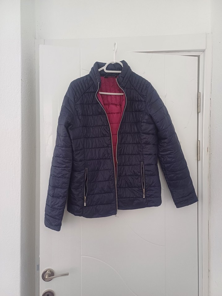 Fermuarlı ön ve iki fermuarlı cepli, uzun kollu, normal midi boyda, lacivert renkli, yumuşak ve sıcak kumaştan yapılmış kadın mont.