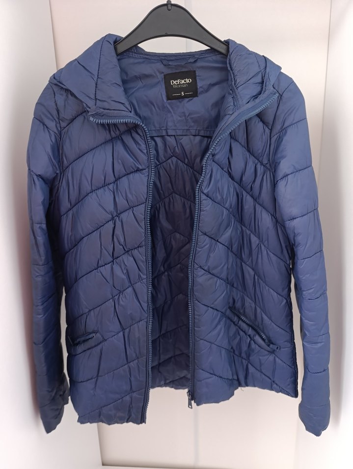 Lacivert kadın mont. Resimde görüldüğü gibi kolunda çok küçük bir kusur var.
