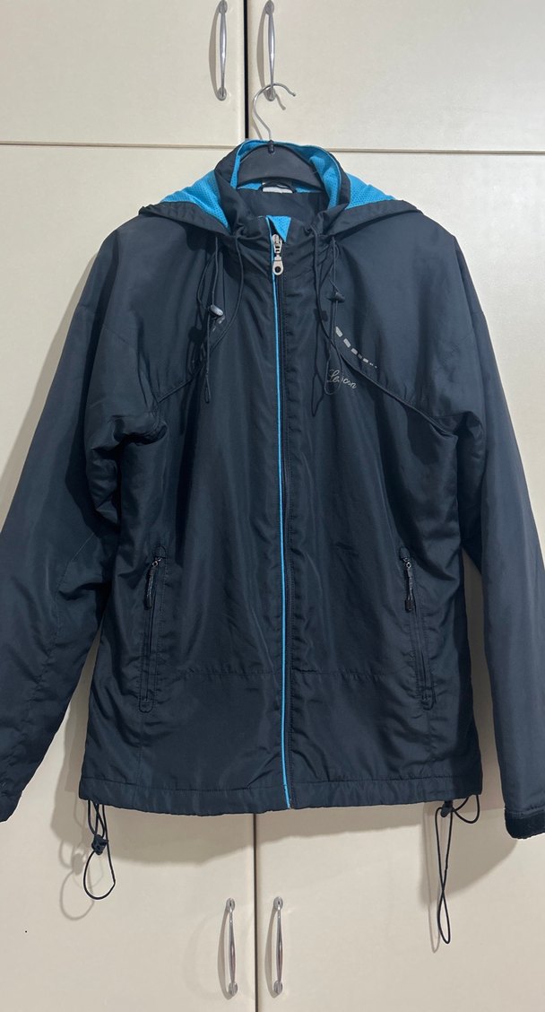 Fermuarlı, uzun kollu ve düğmeli yakalı lacivert kadın spor cekettir. Rahat ve sıcak kumaşlı, dış mekan kullanımına uygundur. Ayarlanabilir ipler ve fermuarlı cepler bulunur.
