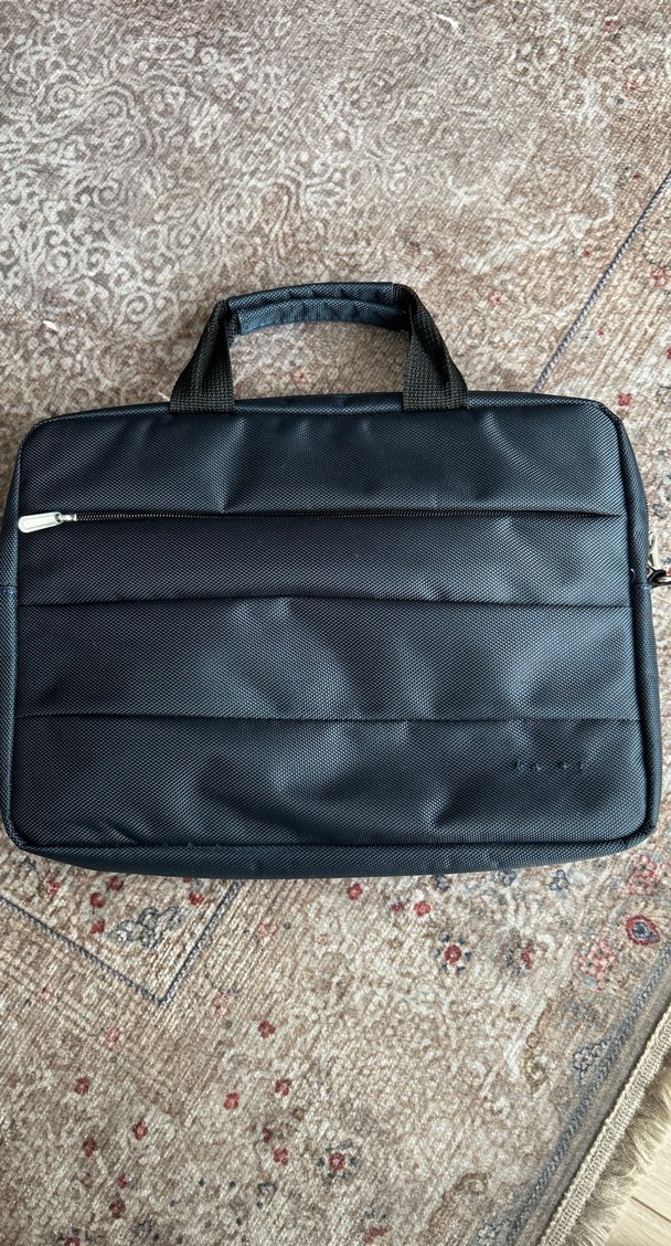 Fermuarlı kapama ve dayanıklı sentetik kumaştan yapılmış lacivert laptop çantasıdır.