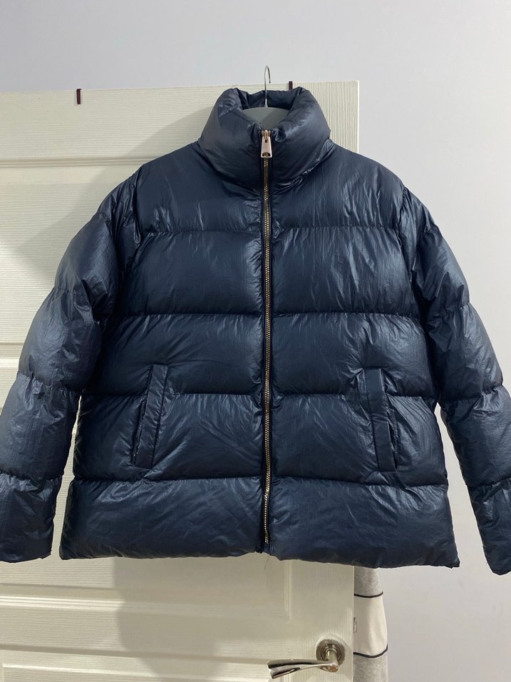 Fermuarlı önü ve yüksek yakasıyla koyu mavi şişme mont, normal boyda ve askılı kollu, rahat ve dar kesim sokak stili sunar.