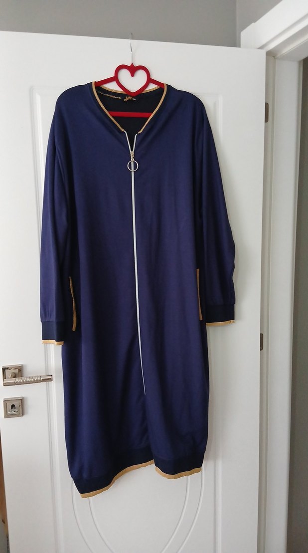 Lacivert, uzun boy, fermuarlı, bol kesim hamile ceketi. Uzun kollu, yuvarlak yaka, yumuşak ve sıcak kumaştan yapılmıştır.