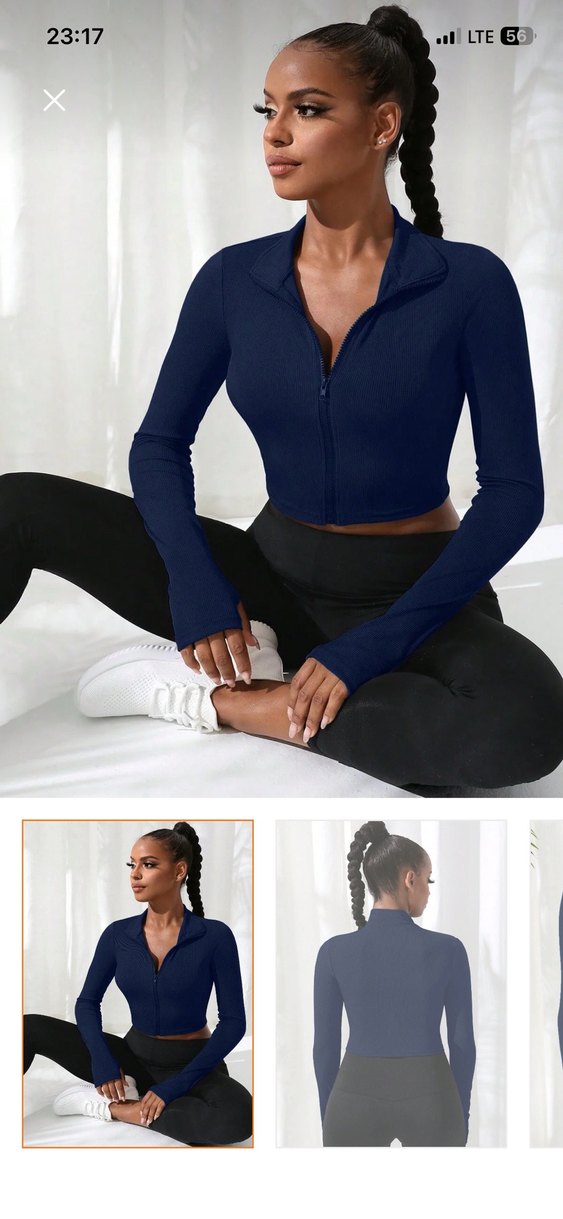 Fermuarlı, uzun kollu ve yüksek yakalı lacivert crop üst. Sentetik kumaştan, spor ve sokak stili için uygun.