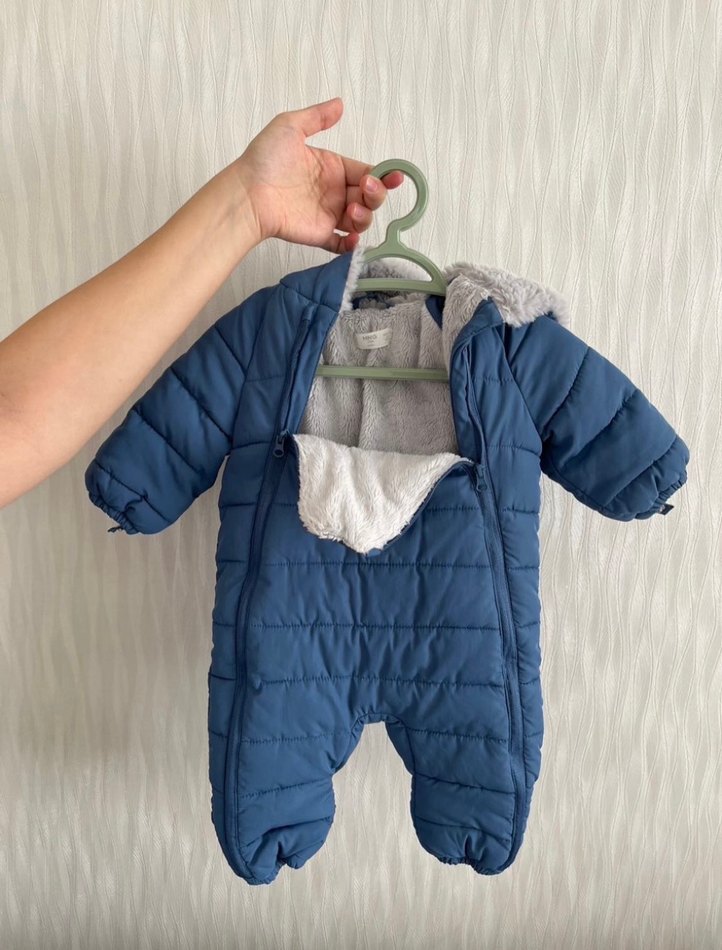 Yumuşak gri kürklü astarlı, fermuarlı mavi bebek tulumu, soğuk havalar için sıcak tutar ve konfor sağlar. ❄️