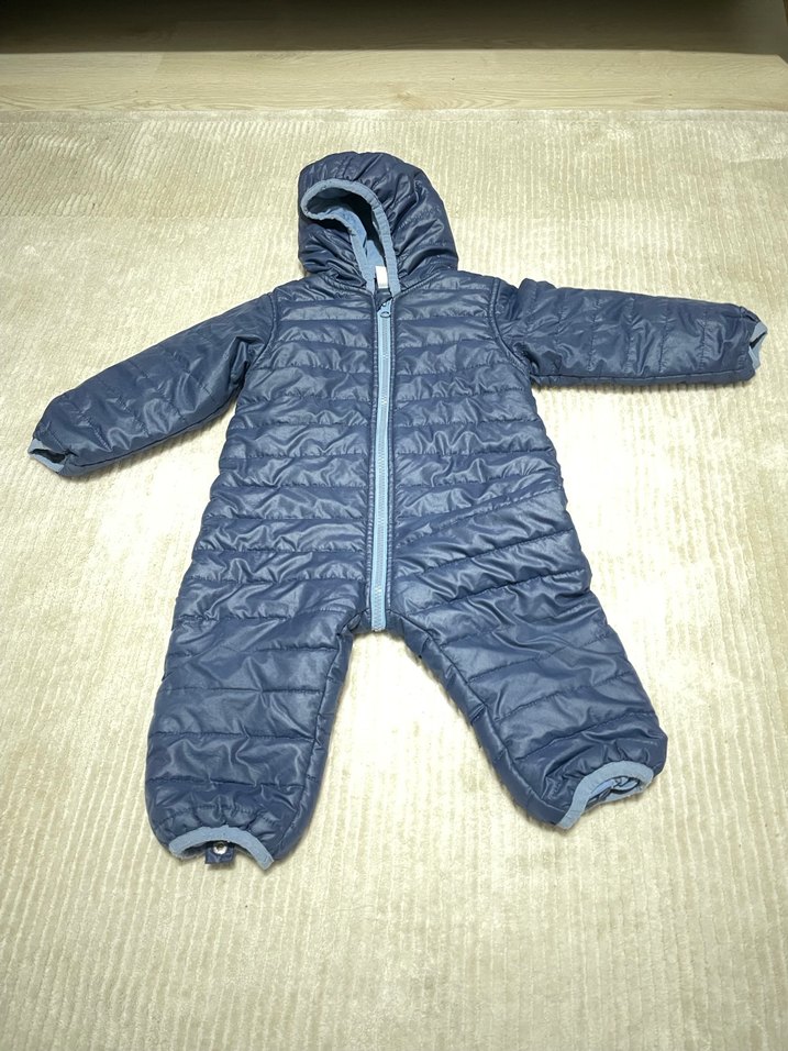 Fermuarlı ve kapüşonlu, yumuşak ve sıcak kumaştan yapılmış mavi-gri tonlarında bebek tulumu. Desensiz ve sokak stiline uygun.