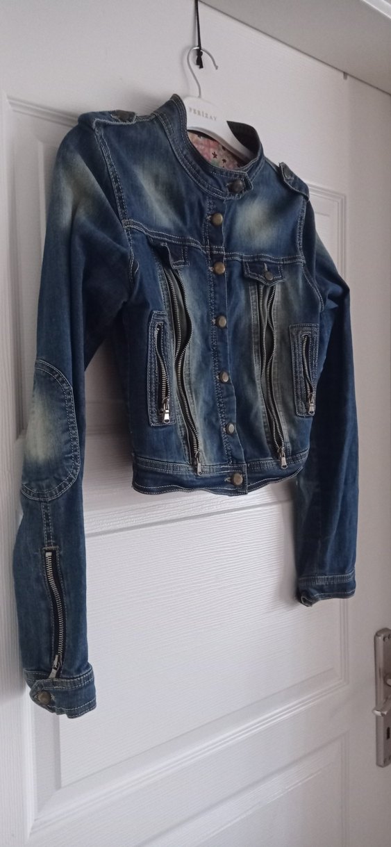 Fermuarlı cepleri ve kesik yakasıyla fitted mavi denim biker ceket, uzun kollu ve streç kumaş yapılmış, günlük kullanım için uygun.