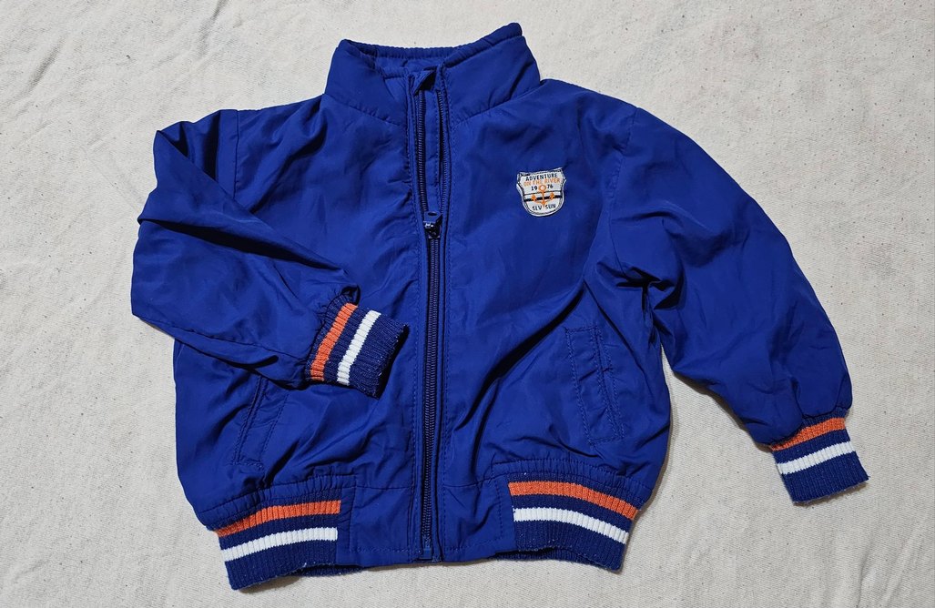 Fermuarlı ve yakası notalı, renkli çizgili manşet ve etek ucu bulunan mavi, kalıplı ceket. Yumuşak ve sıcak dokuda, trend rahat stil için uygun.