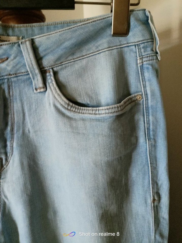fermuarli, mavi denim kadın pantolon, normal midi boyda ve sade, gündelik tarzda. Günlük kullanım için uygun. Shot on realme 8.