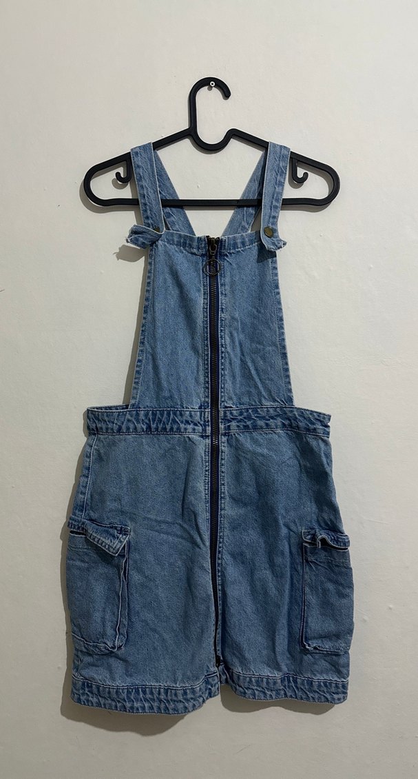 Fermuarlı ön kısmı, yüksek yakası ve ayarlanabilir askılarıyla mavi denim kısa tulum . Yan cepli