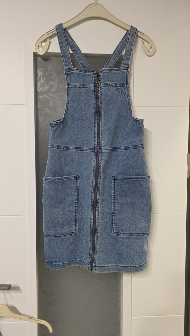 Fermuarlı, yüksek yakalı ve kolsuz mavi denim midi tulum. Önünde iki büyük cep ve fitted kesim bulunur, günlük sokak stili için uygundur.