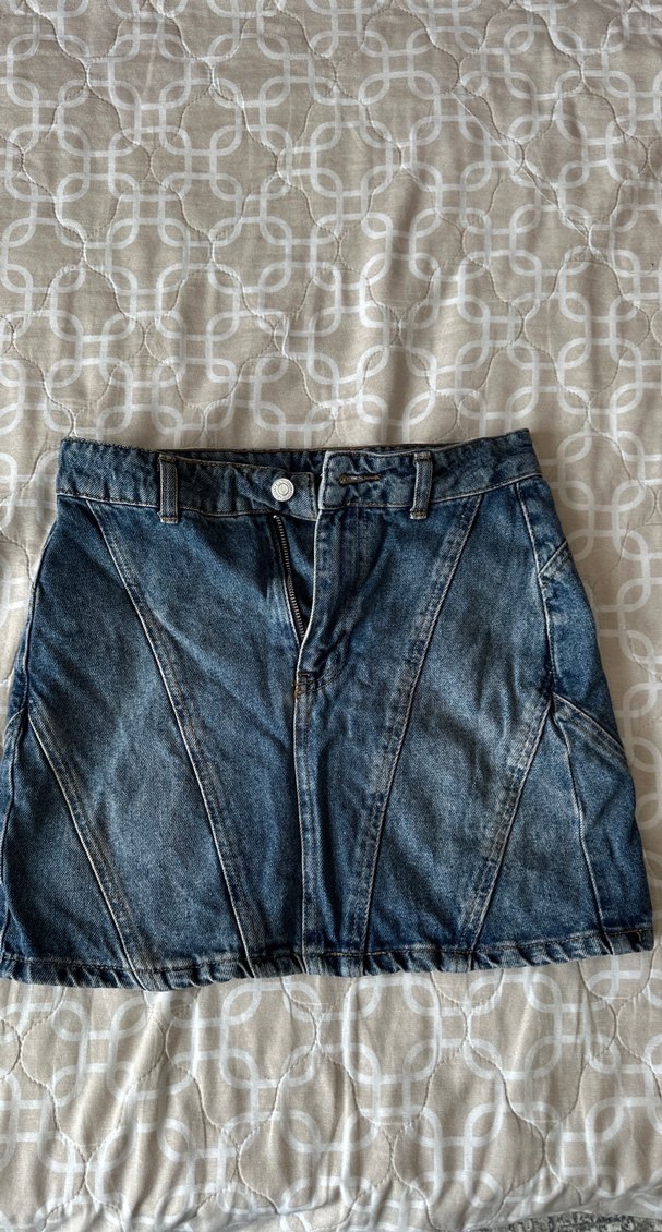 Fermuarlı ve düğmeli, mavi renkte, vücuda oturan denim mini etek. Günlük kullanıma uygun, rahat ve şık bir tasarım.