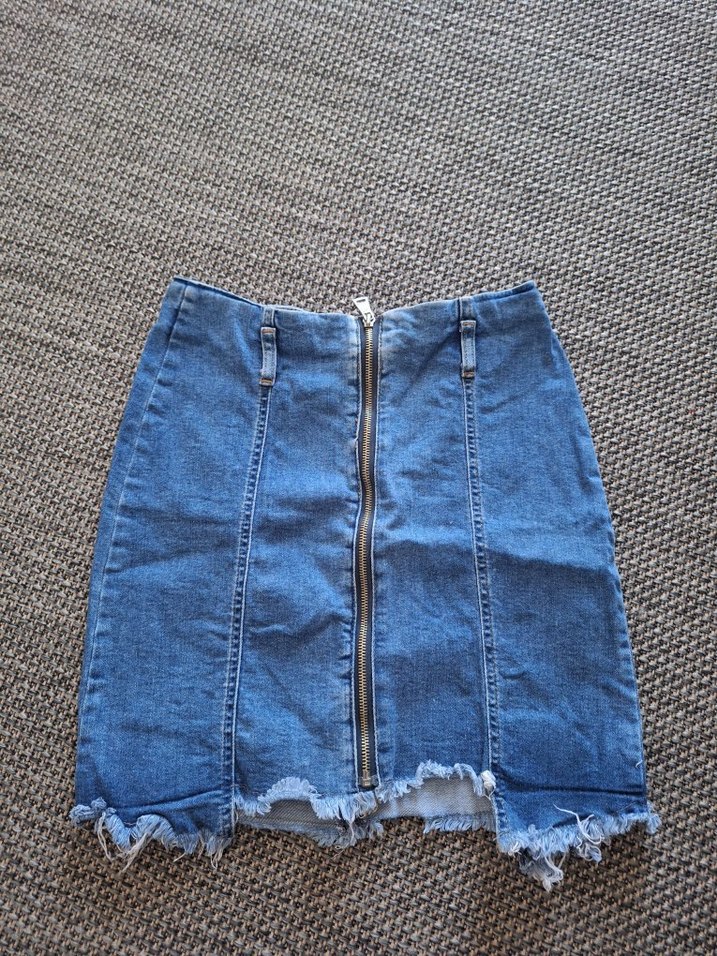 Ön fermuarlı, yıpranmış kenarlı, mavi denim mini etek. Normal uzunlukta, dar kesim ve günlük kullanım için uygun.kalem etek kalıbında hafif esnek çok kullanışlı ben 550 ye almisdim bikez giydim .