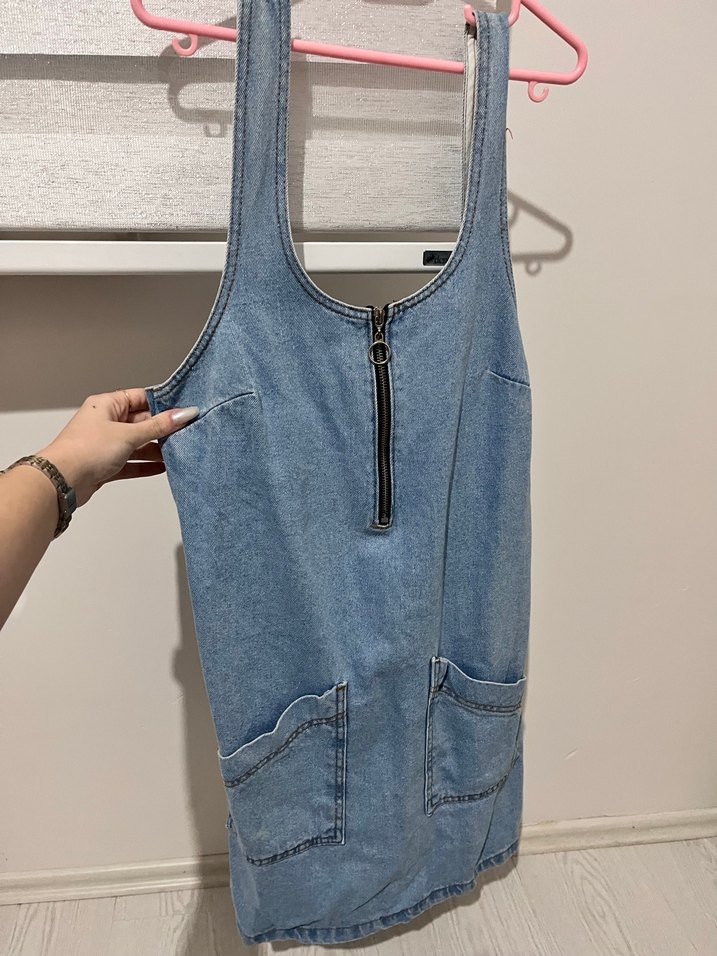Fermuarlı, askısız ve kolsuz mavi denim mini salopet. Önde fermuar ve cepler bulunur, günlük rahat kullanım için uygundur.
