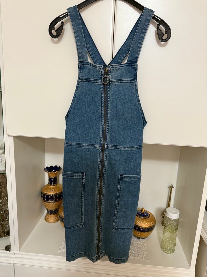 Önü fermuarlı, askılı, hafif batik desenli mavi denim tulum. Sokak tarzına uygun, vücuda oturan kesimde.