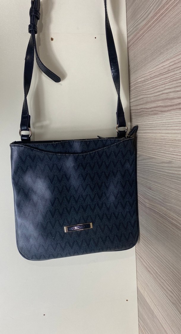 Mavi sentetik kumaştan fermuarlı, desenli kadın çantası, günlük kullanım ve sokak stili için uygundur.