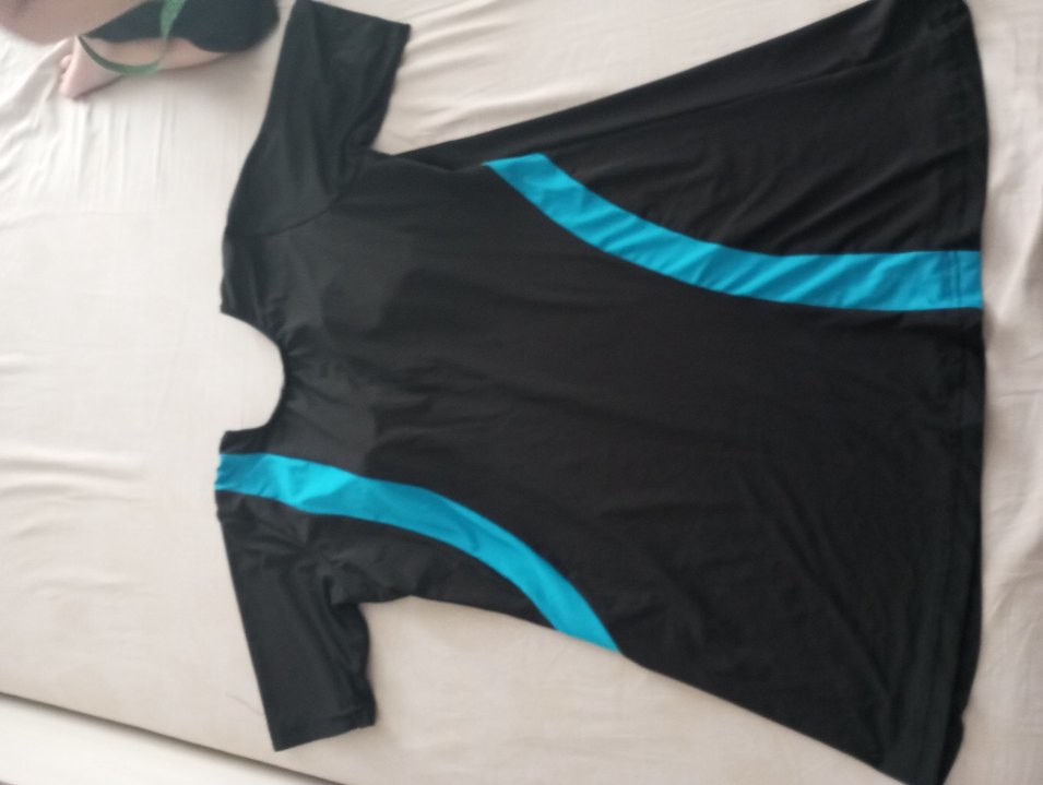 Fermuarlı, koyu mavi renkli ve canlı mavi detaylara sahip, kısa kollu, midi uzunlukta kadın mayo. Spor ve sokak modası tarzını birleştirir. ♀️