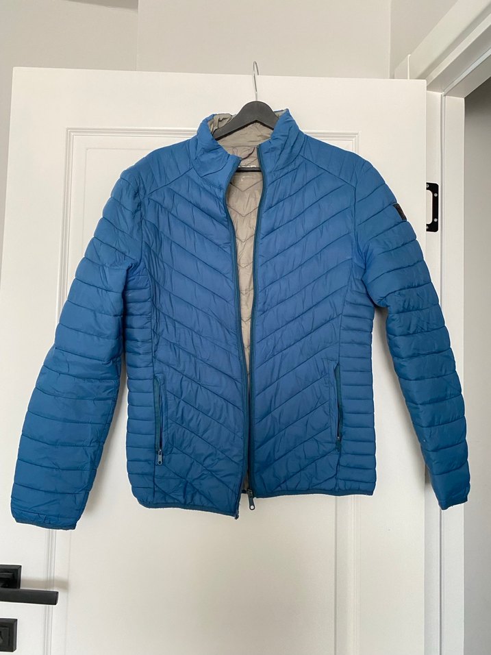 Fermuarlı, uzun kollu, mavi renkli, sentetik kumaştan yapılmış, normal midi uzunlukta ve kesimli kadın ceket. Günlük kullanım için uygun, streetwear ve athleisure tarzına uygun.