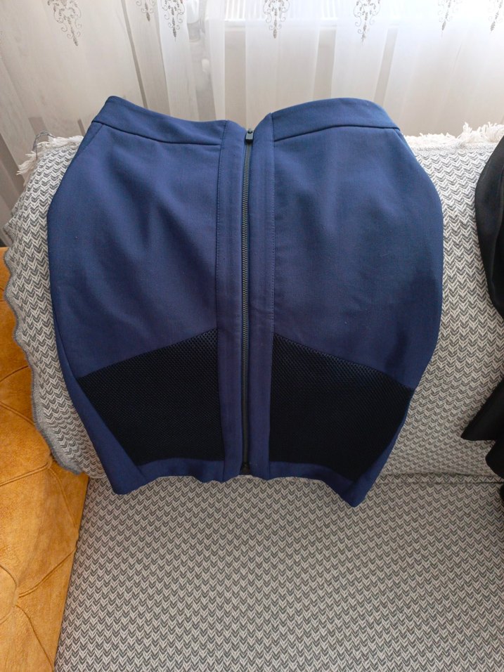 Fermuarlı, siyah file detaylı, sentetik kumaştan midi mavi eteği, sokak stili athleisure görünümü sunar. 38 beden ipekyolu markalı