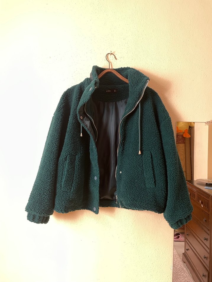 Fermuarlı, uzun kollu, yeşil renkli, midi uzunlukta, bol kesim kadın ceket. Rahat ve sıcak kumaştan üretilmiştir.