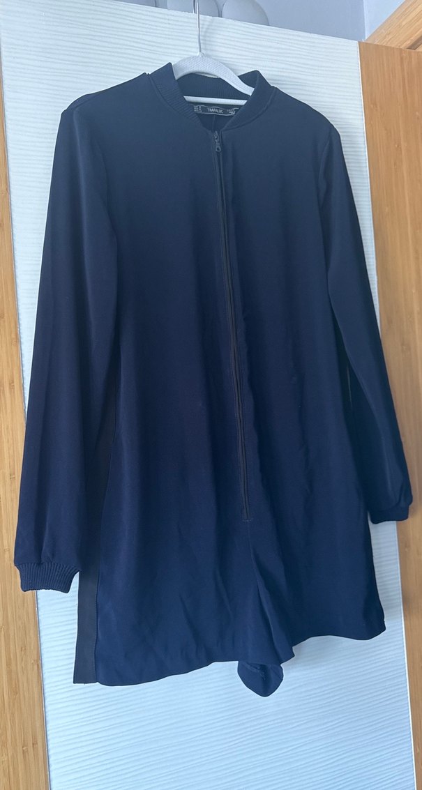 Lacivert mini uzunlukta, uzun kollu, yuvarlak yaka şort tulum . Rahat kesim, fermuarlı ve yumuşak dokulu kumaştan, ofis için uygun.