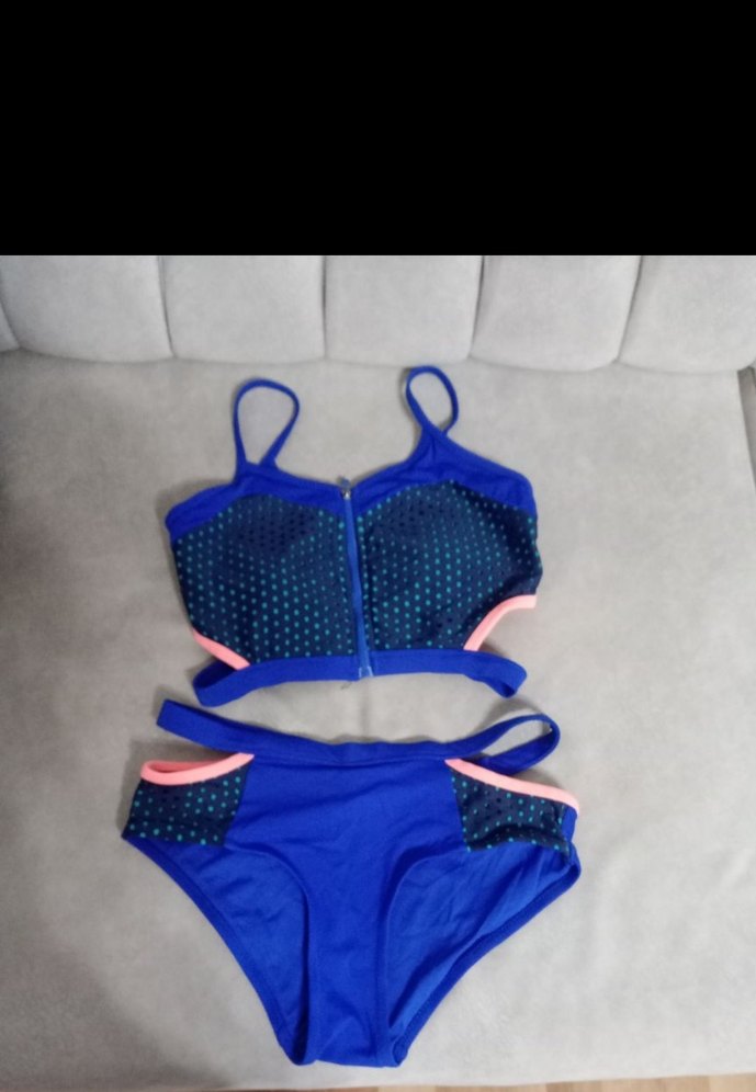 Fermuarlı, ince askılı, mini uzunlukta mavi bikini. Renkli detayları ve sıkı kesimiyle plaj için uygun.
