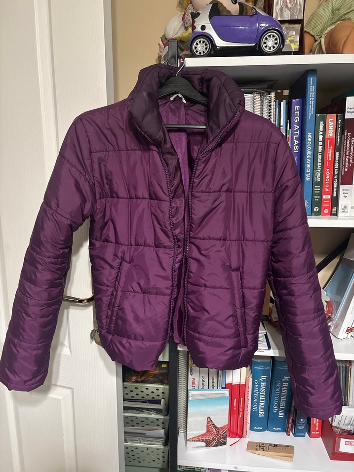 Koyu mor renkli kadın mont, yüksek yaka ve fermuarlı ön yapıya sahiptir. Ürünü çok fazla giymedim, kilo aldığım için dar oluyordu. Dolapta beklemesin diye satmaya karar verdim. Fermuarındaki soyulma dışında herhangi bir deformitesi yok, soğuk havalar için uygun, kollarının ve belinin büzgülü olması açılmayı engelleyip daha iyi koruyor ve çok havalı duruyor #defacto #mont #ceket #kaban