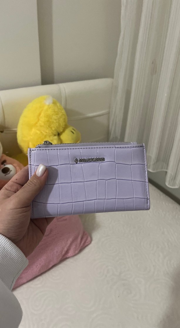 Pastel mor deri kadın cüzdanı, fermuarlı ve hafif yılan derisi desenli, trend sokak modasına uygun.