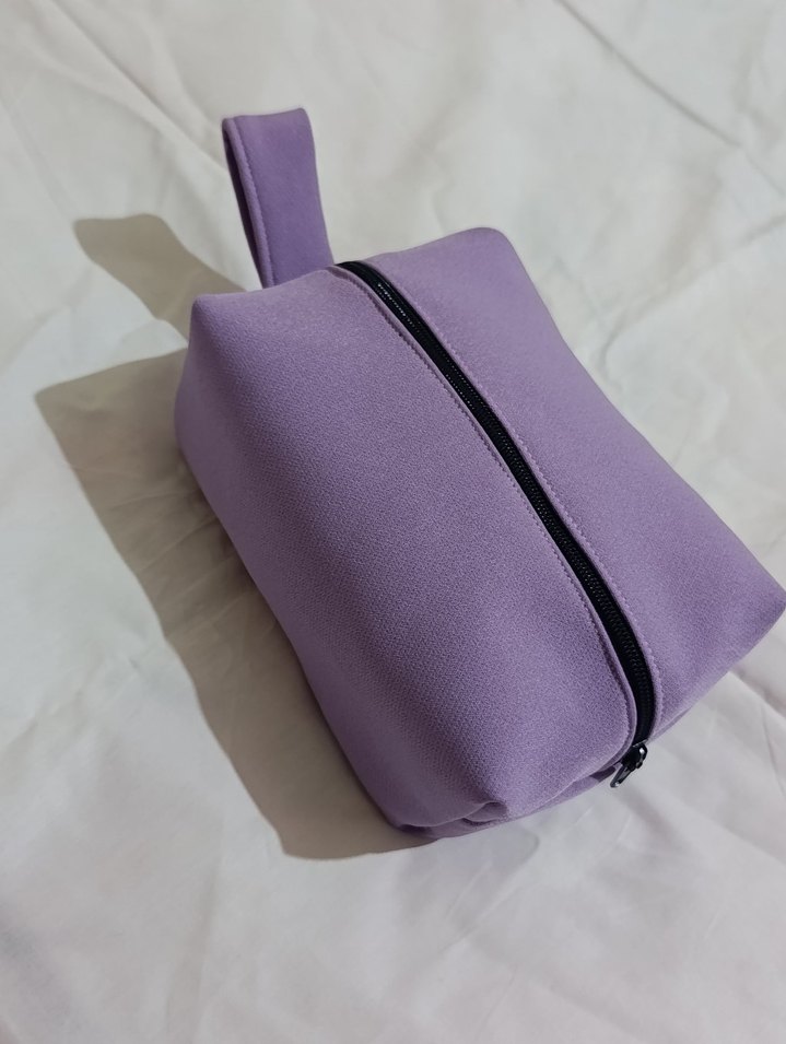 Fermuarlı, yumuşak dokulu mor makyaj çantası, günlük kullanım için minimalist ve sokak tarzına uygun.
