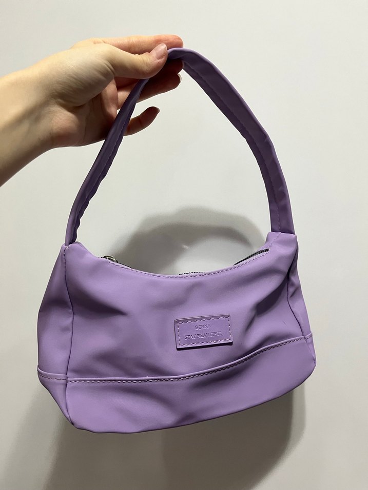 Pastel mor renkte, düz tasarımlı, fermuarlı ve yumuşak sentetik kumaştan yapılmış kadın omuz çantası.