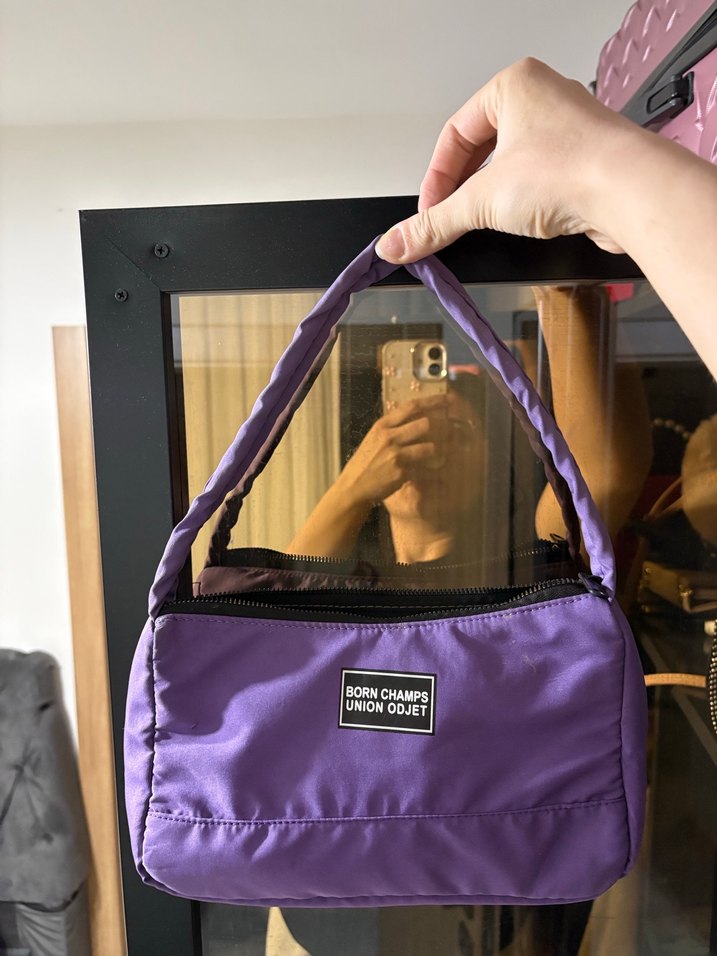 Mor renkli, fermuarlı ve baskılı desenli kadın çantası. Sentetik kumaştan üretilmiş, minimal ve sokak stiline uygun günlük kullanım için ideal.