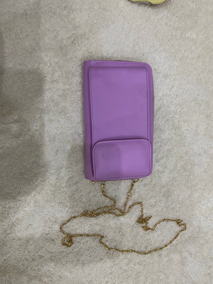 Fermuarlı kapanışı ve küçük ön cepli, pastel mor süet kadın portföy cüzdan. Minimalist ve çağdaş tasarıma sahip, altın zincir askılıdır. Günlük kullanıma uygundur.