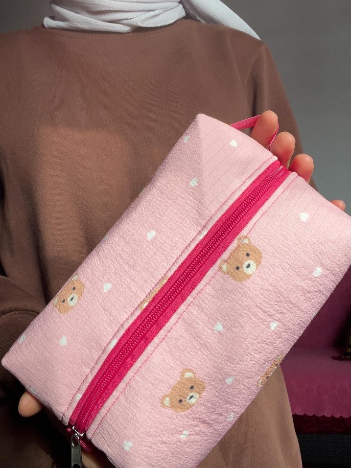 Fermuarlı ve yumuşak kumaştan yapılmış pembe makyaj çantası, ayıcık desenli ve pastel tonlarda, günlük kullanım için uygundur. Keçe tela ile desteklenmiş orta boy makyaj çantası
