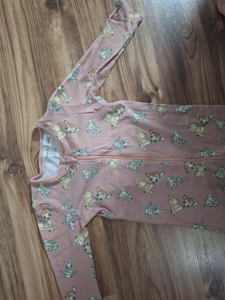 Pastel pembe renkli, baskılı ve fermuarlı bebek kız tulumu.