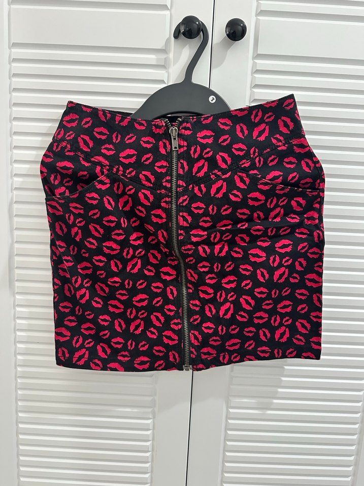 Sentetik kumaştan yapılmış, koyu pembe dudak baskılı, fermuarlı ve vücuda oturan mini etek.