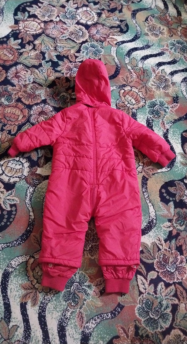 Fermuarlı ön kısmı ve yakası kesimli, renkli pembe bebek kız kış tulumu.