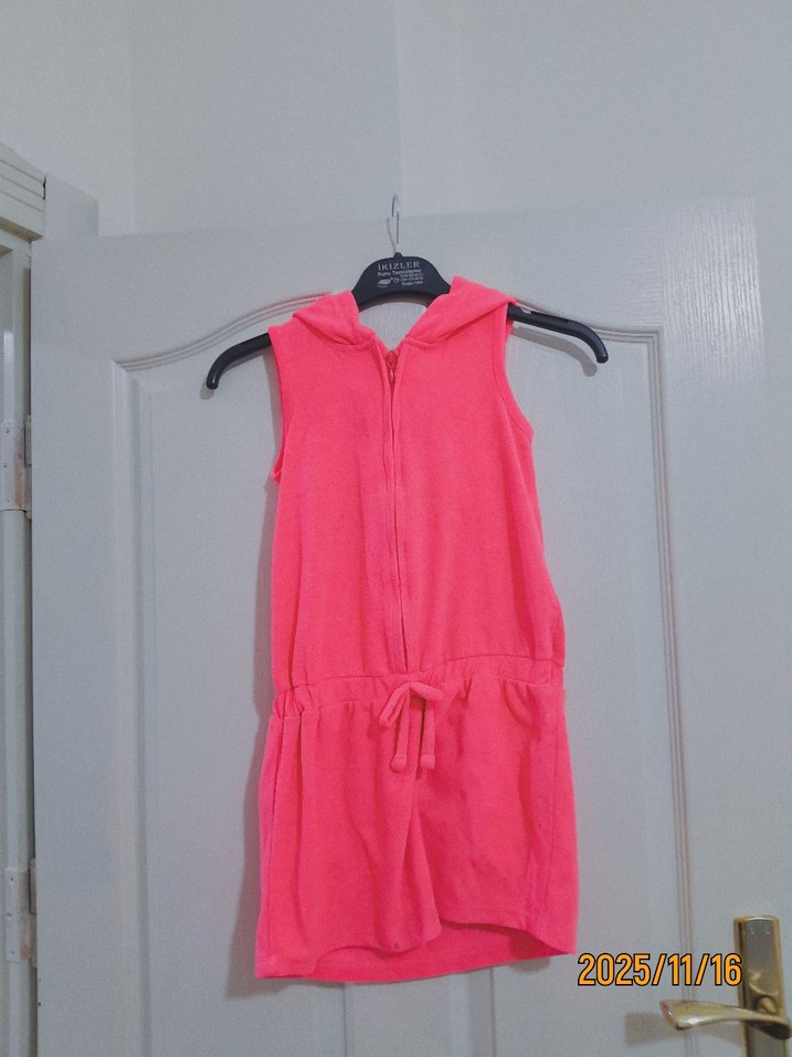 Pembe renkli bebek kız tulumu, ön fermuarlı ve belinde bağcıklıdır. Yumuşak kumaştan yapılmıştır ve canlı renklidir. Fotoğraf tarihi 2025/11/16.