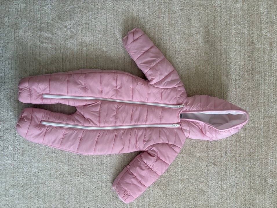 Pastel pembe renkte, fermuarlı ve yakası kesimli bebek kız tulumu. Soğuk havalar için sıcak ve rahat tutar. Ebebek ürünü hiç kullanılmadı