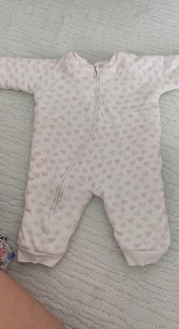 Fermuarlı ve bisiklet yaka pembe pastel bebek kızı tulumu, yumuşak kumaştan ve hafif kalp desenli.%100 pamuklu üründür boyun kısmında hafif sarartı vardır gönderilmeden önce tekrar yıkayıp gönderilecektir
