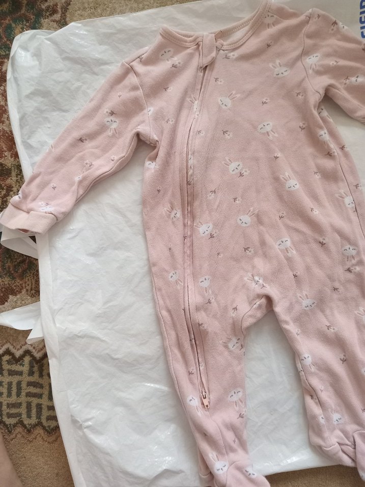 Pastel pembe renkte, fermuarlı ve yumuşak kumaşlı bebek tulumu. Üzerinde küçük tavşan desenleri bulunur, rahat giyilir.