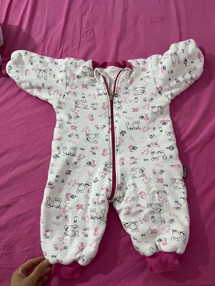 Fermuarlı, yüksek yakalı ve renkli desenlere sahip pembe bebek tulumu. Sıcak tutan yumuşak kumaştan yapılmıştır. ❄️