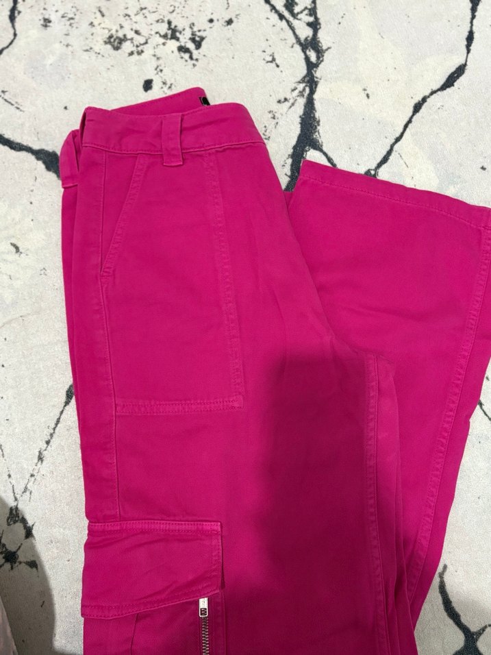 Hiç giyilmedi -koku deforme yok-Koyu pembe renkli, salaş kesim, fermuarlı detaylı, sentetik kumaştan midi uzunlukta kadın pantolon. Günlük sokak stili için uygun.
