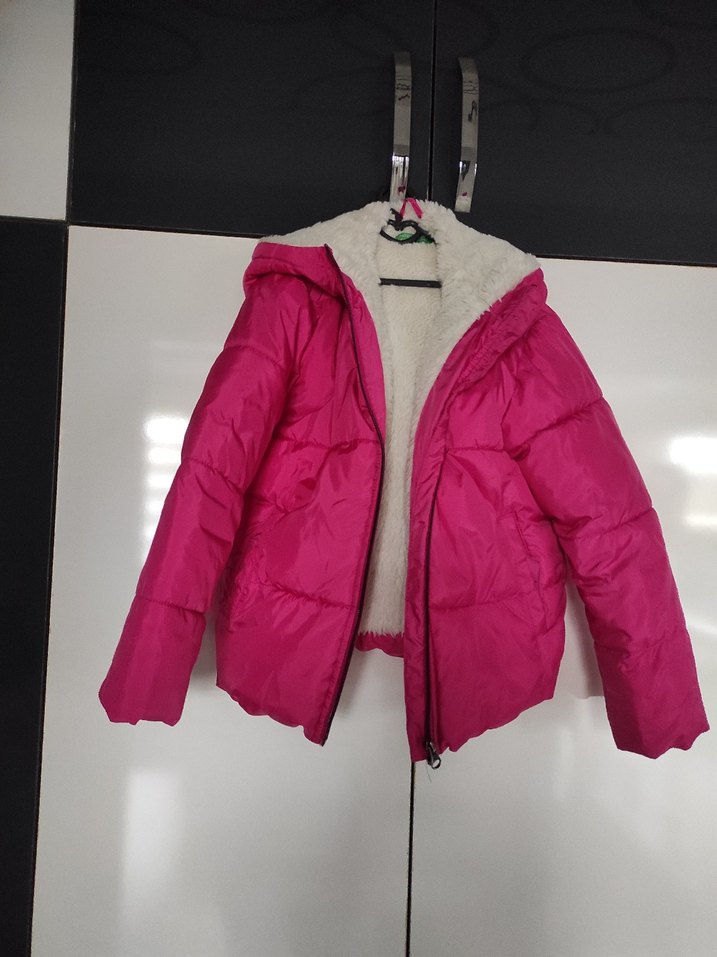Fermuarlı, pembe renkli çacuk kışlık mont, yumuşak ve sıcak kürk astarlı. Uzun kollu, normal midi boyda, trend sokak stili için uygun.