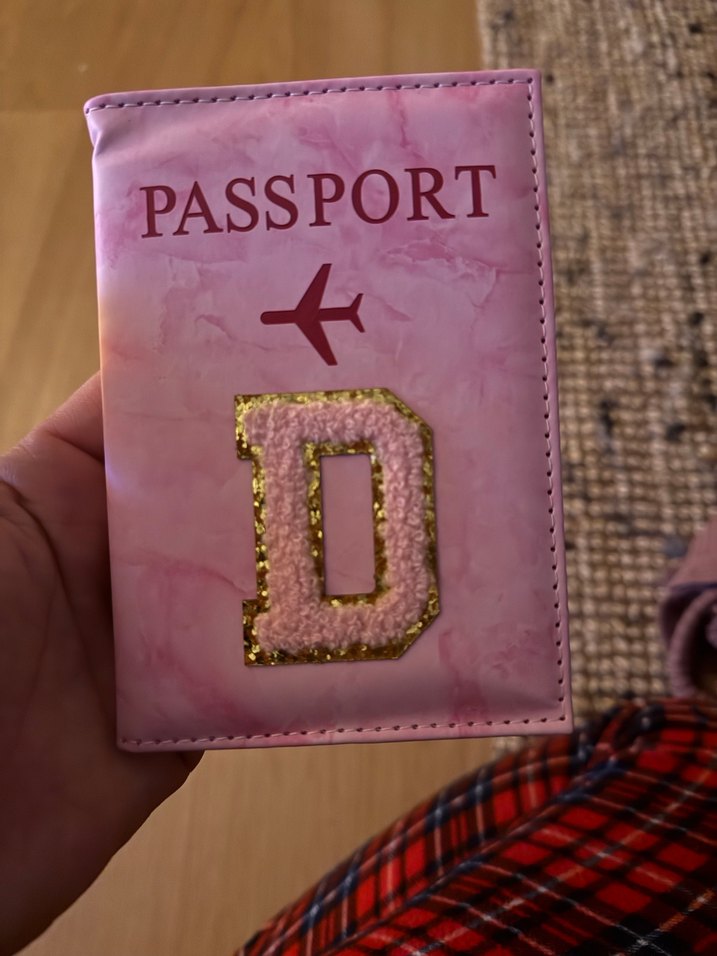 Pembe deri kadın cüzdanı, 'PASSPORT' yazısı ve büyük 'D' harfi baskılıdır. Fermuarlı ve bohem tarzda tasarlanmıştır. ✈️