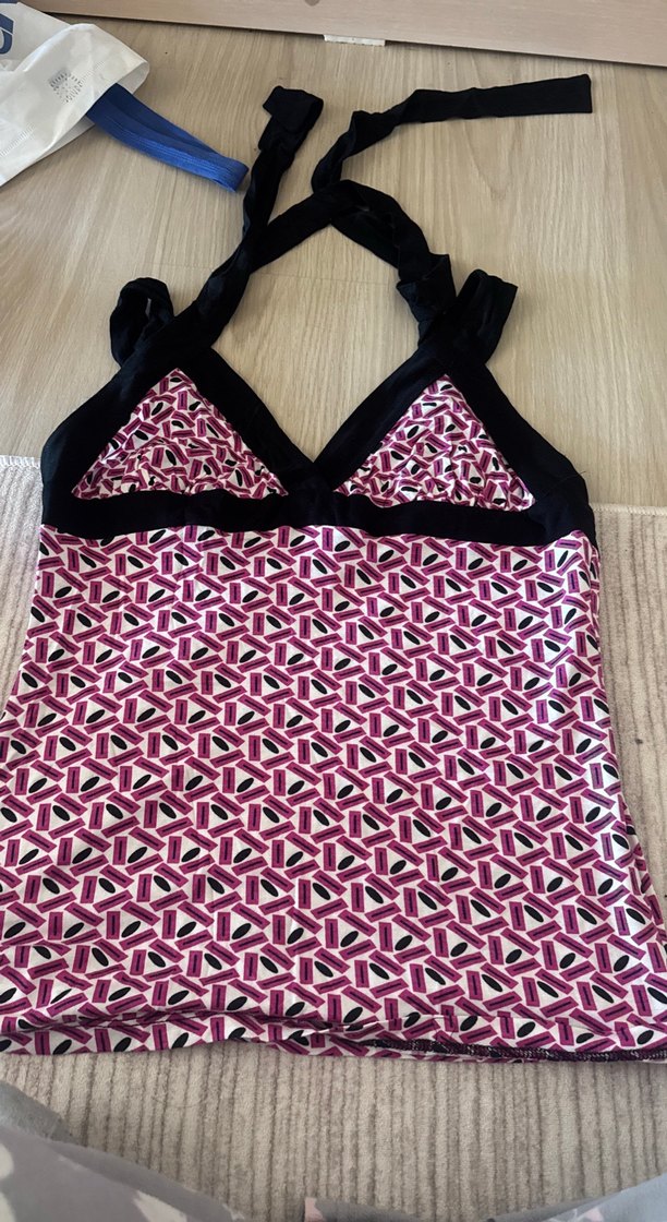 Fermuarlı ön kısmı ve koyu pembe geometrik desenli, askılı, dar kesim mini mayo. Bohem tarzıyla günlük kullanıma uygundur.
