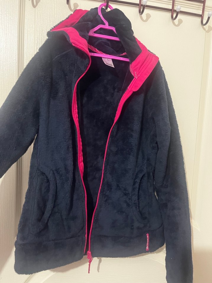 Fermuarlı ve yüksek yakalı bu siyah kız çocuk ceketi, uzun kollu ve pembe detaylıdır. Rahat ve sıcak kumaşıyla günlük kullanıma uygundur.