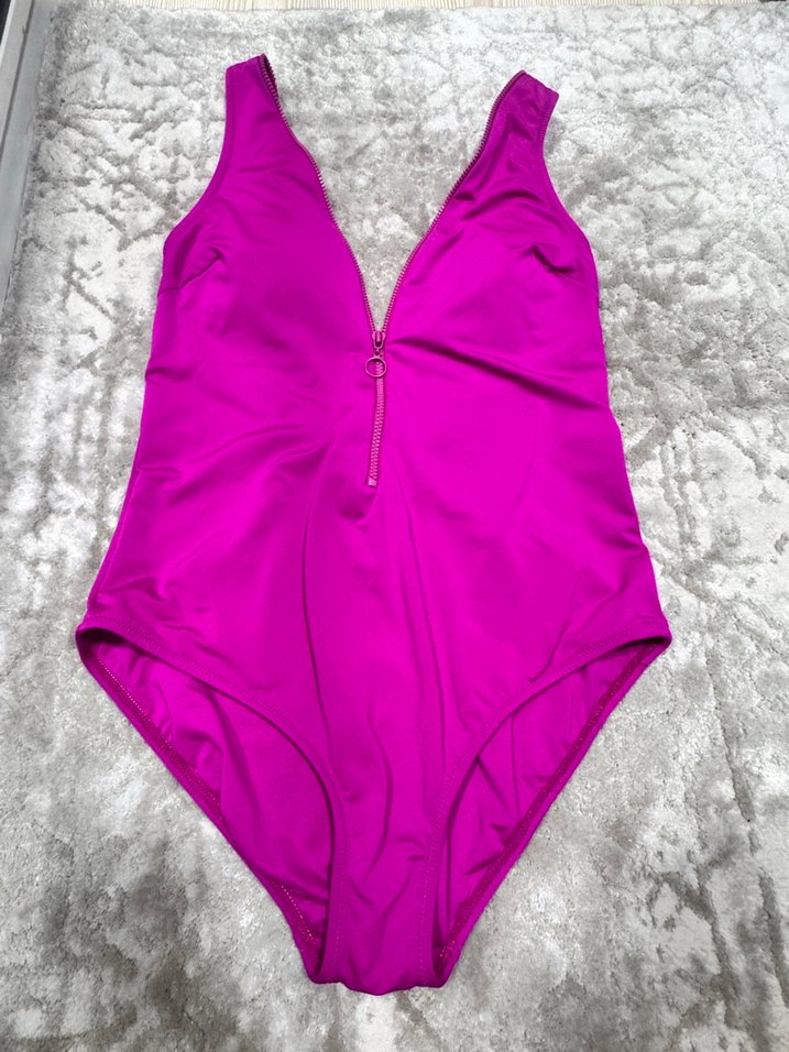 Fermuarlı, kolsuz, pembe renkli, atletik ve cesur tarzda kadın mayo. Ürün çok az giyildi. O kadar şık bir model ki alan asla pişman olmayacak. Öndeki fermuarı ayarlanabilir. istediğiniz seviyede kullanabilirsiniz. 36-38 beden uyumludur.