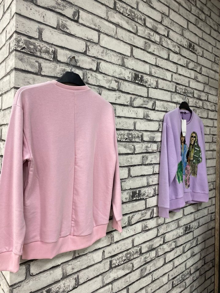 Kadınlar için fermuarlı, yuvarlak yakalı, uzun kollu, bol kesim pembe sweatshirt. Sentetik kumaştan, baskılı ve kısa boylu, günlük kullanım için uygundur.